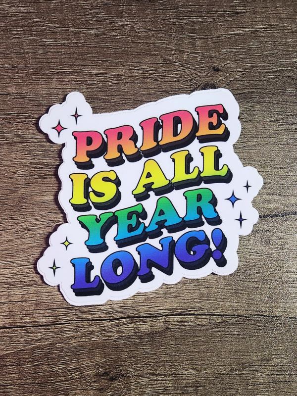 Keep Pride with you every day with our “Pride Is All Year Long!” stickers. This sticker features bold rainbow lettering with playful sparkle accents, celebrating 2-SLGBTQ+ joy, visibility, and liberation beyond just Pride Festival.